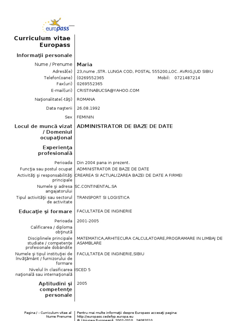 De la cv simplu la cv complex, model european, sau modele in diferite limbi. Aptitudini şi competenţe artistice (muzică, desen, pictură, literatură etc.) aptitudini şi competenţe sociale Ministerul educatiei si cercetarii romania. La limba şi literatura română , desfăşurat sub coordonarea prof. And do you know curriculum vitae europass completat in romana friends become fans of curriculum vitae europass da american u thesis as the best book to read.